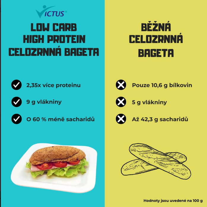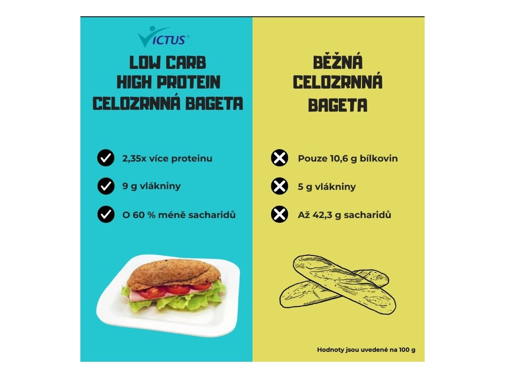 Nadýchaná proteinová bageta výborné chuti, tu musíte vyzkoušet! Vzhledem i chutí je velmi podobná grahamovému pečivu. Doporučujeme v kombinaci se sýrovou pomazánkou či paštikou z naší nabídky a libovolnou zeleninou! Nebo si můžete vyrobit pomazánku z povolených surovin podle vlastní fantazie, použít plátek kvalitní šunky... Ideální pro výrobu obložené bagety nebo chuťovek, které si nyní můžete bez výčitek dopřát i v dietním režimu.